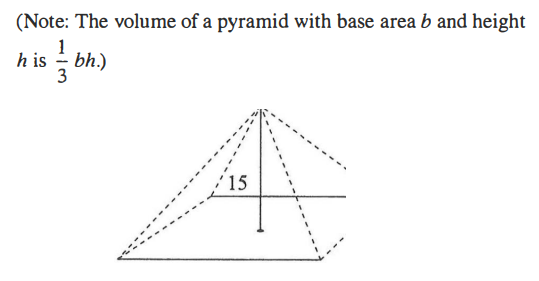 A gallon is 231 cubic inches. Which of the following is closest to the area of the base, in square inches, of a pyramid shaped container, shown below, with height 15 inches and volume 2 gallons?
