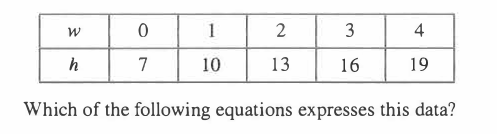 As an experiment in botany class, students tracked a plant growing at a constant rate upward, perpendicular to the ground. As shown in the table below, they measured the height, h inches, of the plant at I-week intervals from w = 0 weeks to w = 4 weeks.