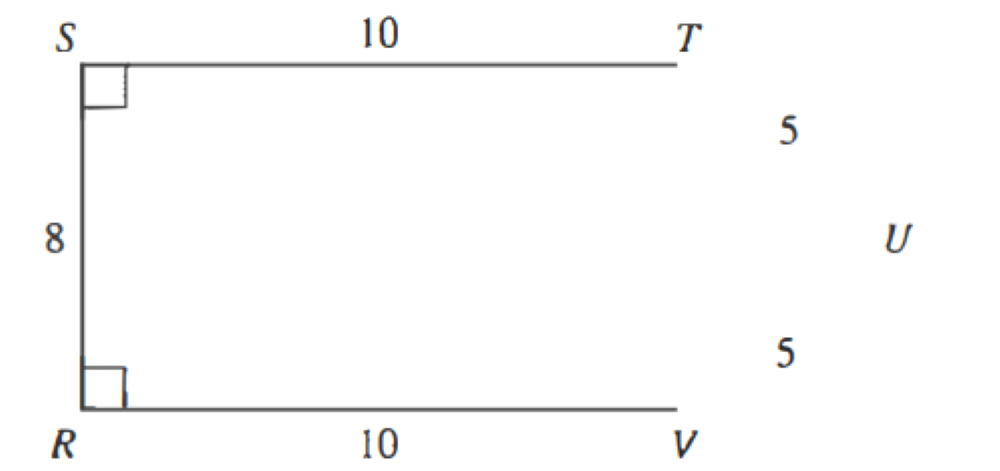 In the figure below, the lengths of the sides are given in inches. What is the total area of pentagon RSTUV, in square inches?