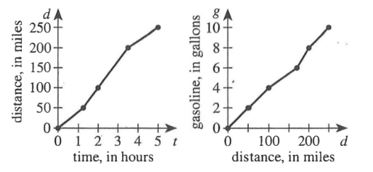 The 2 graphs shown below represent a car trip. The graph on the left shows the total distance as a function of time. The graph on the right shows the total number of gallons of gasoline used as a function of the total distance. Approximately how many gallons of gasoline were used during the first 2 hours of the trip?